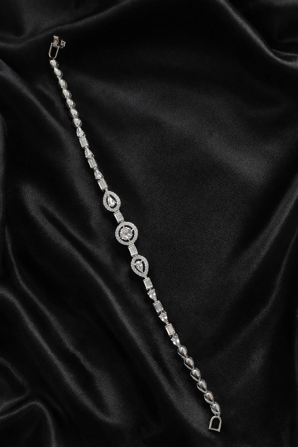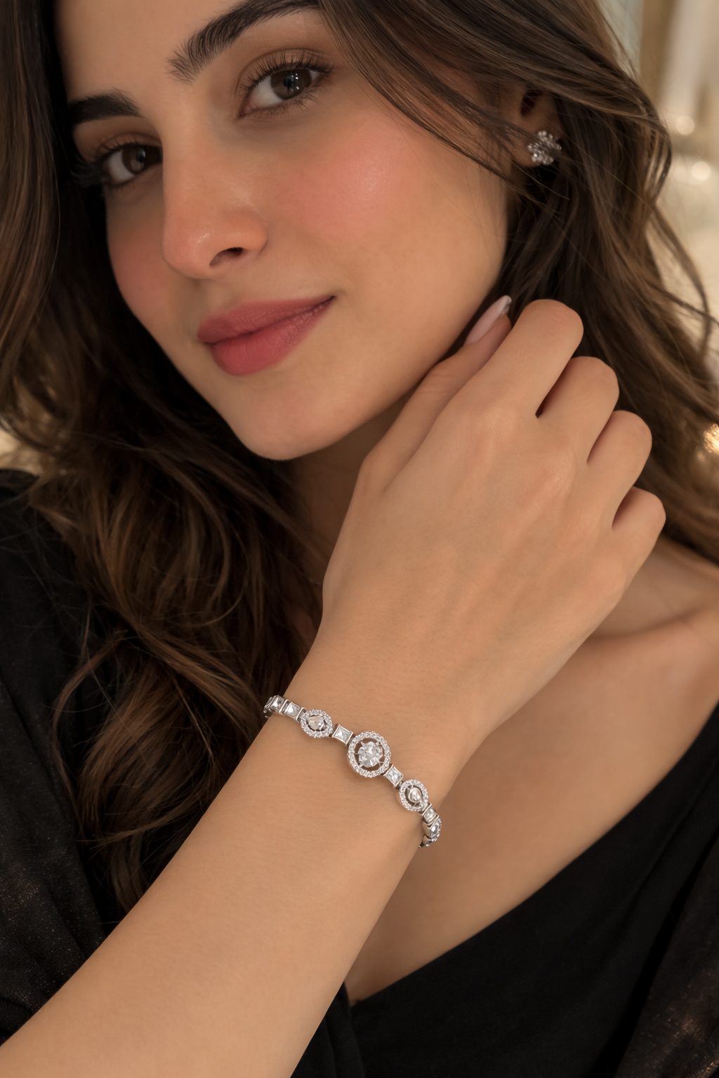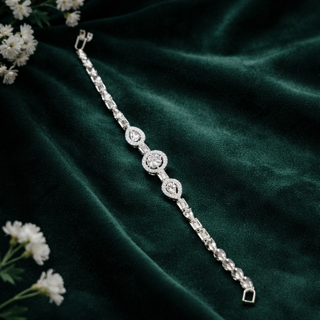 Add a touch of timeless elegance with the Celestia Halo Crystal Bracelet. Designed with sparkling baguette-cut crystals and delicate pear and round halo motifs, this silver-tone bracelet beautifully reflects light from every angle. Its refined floral centerpiece and graceful design make it perfect for weddings, parties, or elevating everyday style. A stunning piece that blends modern sophistication with classic charm. ✨