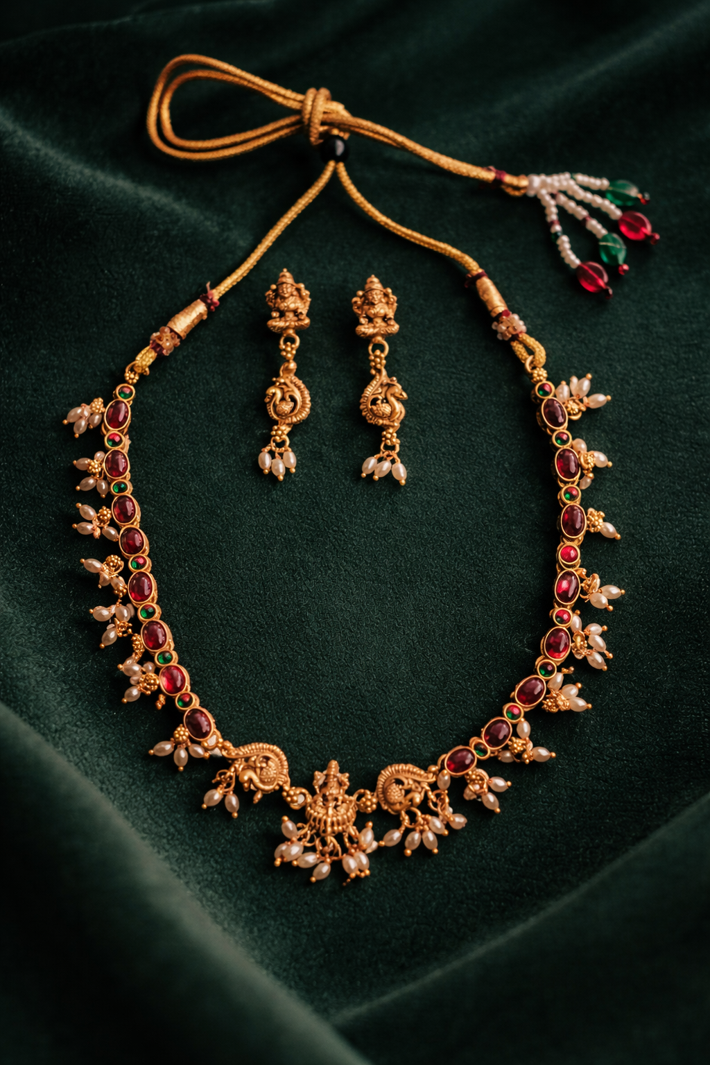An exquisite traditional gold necklace set inspired by timeless temple jewellery artistry. Adorned with rich ruby-red and emerald-green stones, delicate pearl droplets, and an intricately crafted Lakshmi pendant, this piece radiates grace and heritage. Paired with matching statement earrings, it perfectly complements festive wear, weddings, and special occasions.